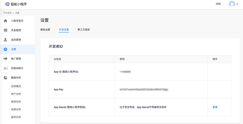 進入“平臺首頁-設置”,獲取 AppID(智能小程序ID)、 App Key、 App Secret(智能小程序密鑰)。