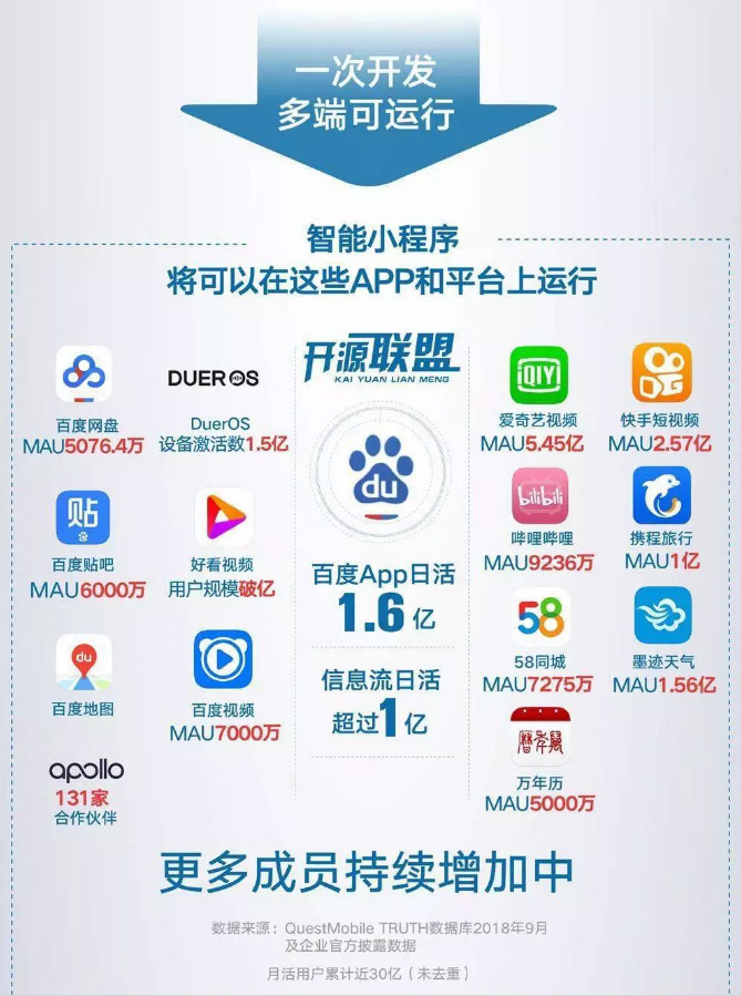 隨后,百度牽頭成立了智能小程序開源聯盟,據稱,開發者一次開發的智能小程序可以在百度 app、百度網盤、百度地圖,甚至快手、愛奇藝、58 同城等 app 上運行。